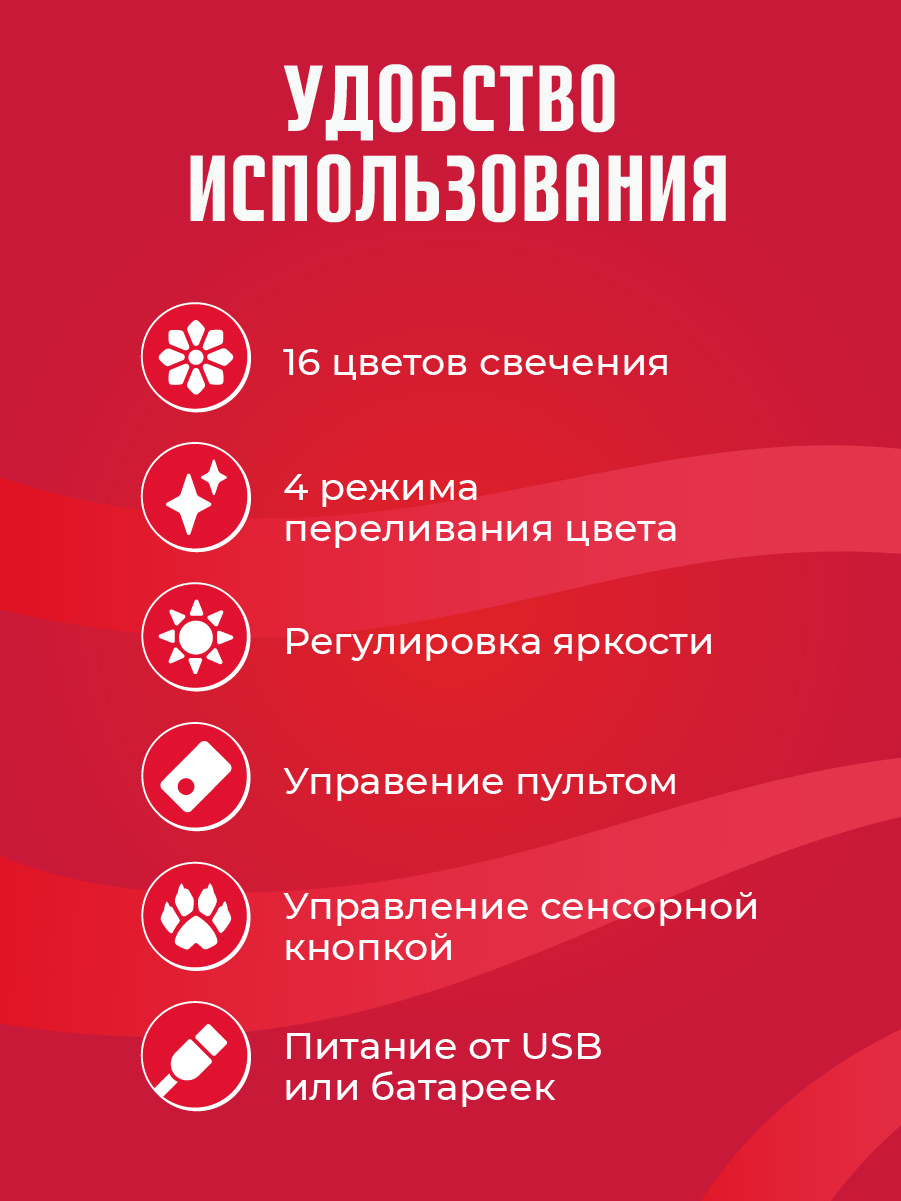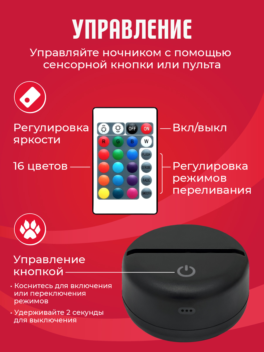 Ночник с любимыми персонажами непременно понравится маленькому поклоннику мультсериала. Поставьте ночник на прикроватную тумбочку или на письменный стол, на подоконник или в гостиную и наслаждайтесь волшебным сиянием и переливанием цветов. Ваш ребенок не захочет расставаться с ярким интересным ночником! Ночник выполнен из качественного органического стекла. В светильнике 16 цветов свечения, 7 уровней яркости и 4 режима переливания цвета. Смена режимов осуществляется с помощью пульта дистанционного управления. Для подключения светильника используйте USB-адаптер 5V или 3 батарейки АА. USB-кабель идет в комплекте. Безопасен для детей: при случайном падении не разбивается на осколки. Питание от USB убережёт от удара электрическим током. Не нагревается при работе.