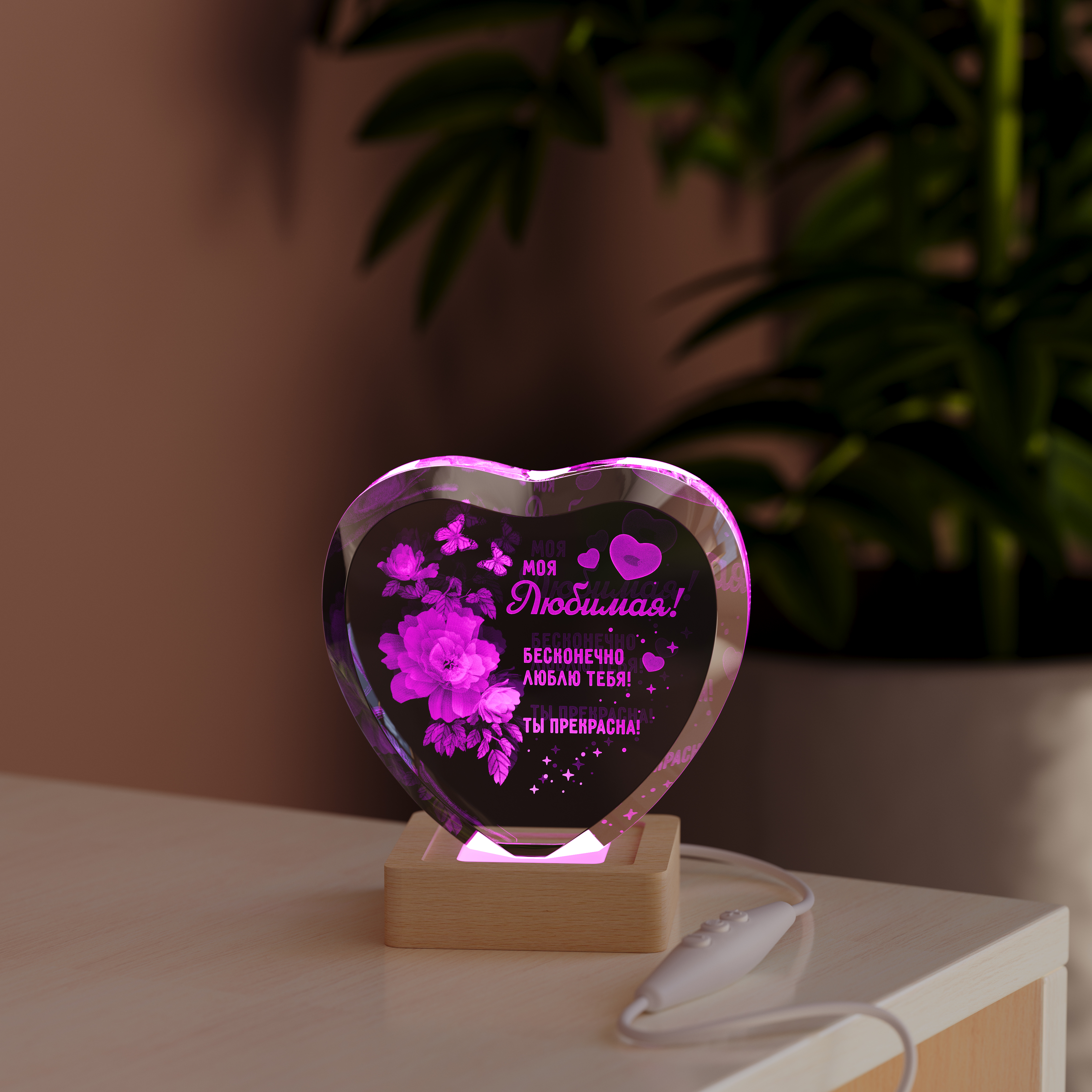 Его мягкое свечение наполнит комнату романтикой, создавая особенную атмосферу для уютных вечеров вдвоём. Благодаря возможности регулировать яркость и переключать цвета, можно легко настроить свечение под своё настроение, добавляя в интерьер нотку тепла и волшебства. Высокое качество гравировки и надёжные материалы гарантируют, что этот подарок будет радовать очень долго, напоминая о вашей заботе.