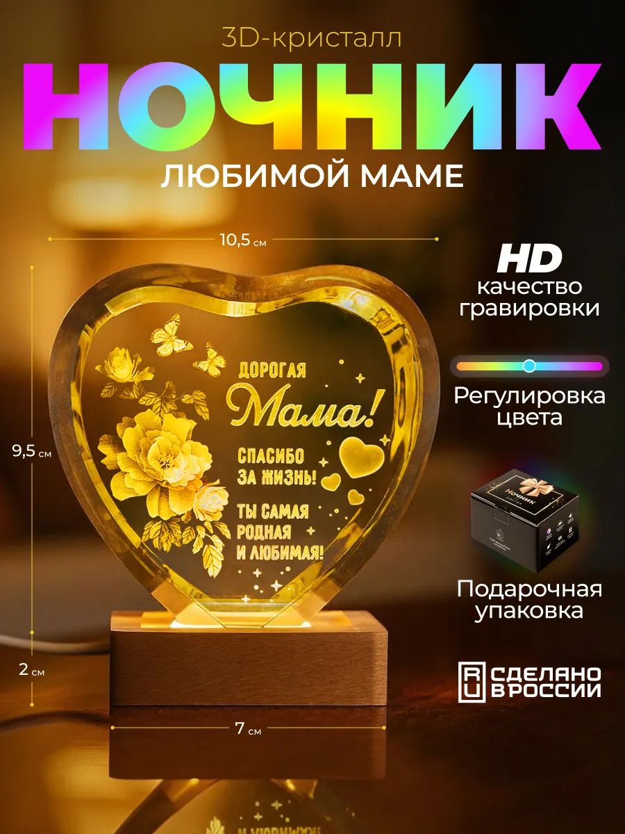 Этот ночник станет изысканным акцентом в любом интерьере, украшая собой прикроватную тумбочку или комод. Высокое качество материалов и ювелирная точность гравировки гарантируют, что этот подарок будет радовать ее своей красотой долгие годы. Презентабельная упаковка завершает образ, делая подарок полностью готовым к тому, чтобы вызвать восторг. Подарите маме не просто ночник, а сияющую частичку вашего сердца, которая будет согревать ее каждую ночь.