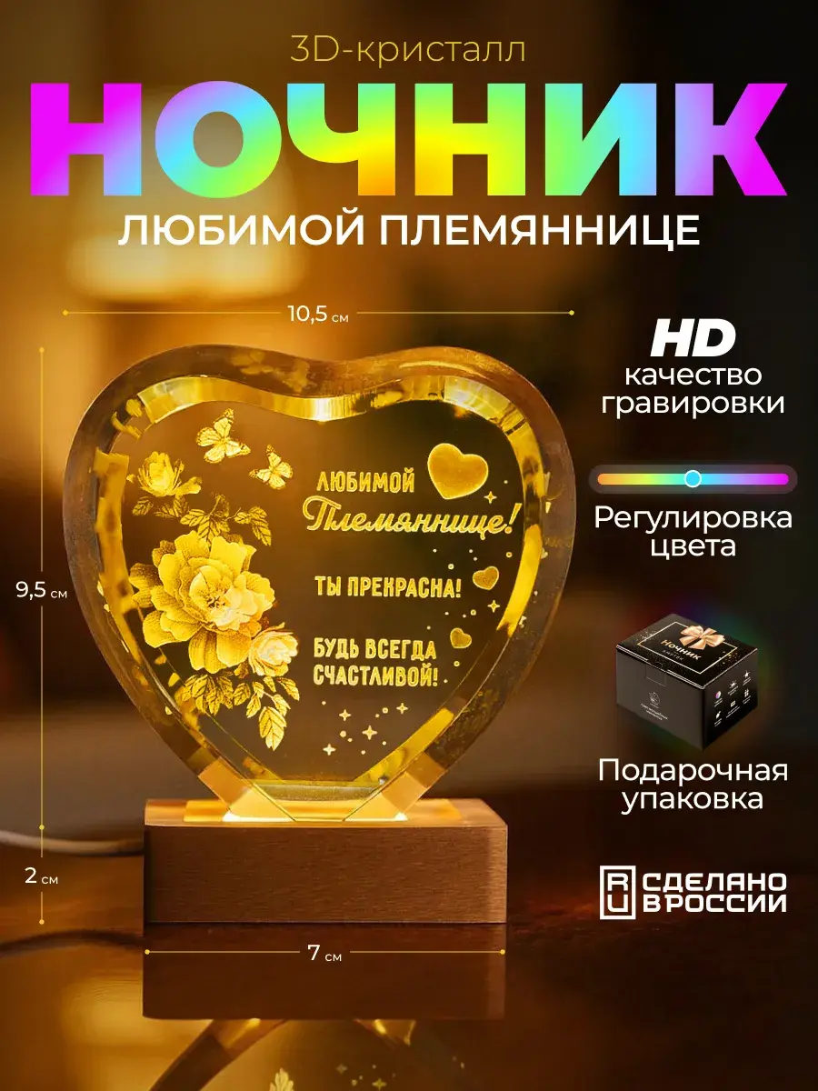 Этот ночник станет прекрасным элементом в интерьере ее комнаты, добавляя нотку изящества. Высокое качество материалов и детальная гравировка гарантируют, что подарок будет долго радовать глаз. Презентабельная упаковка делает его полностью готовым для вручения. Подарите ей не просто ночник, а сияющий кусочек вашей любви, который будет оберегать ее сны.
