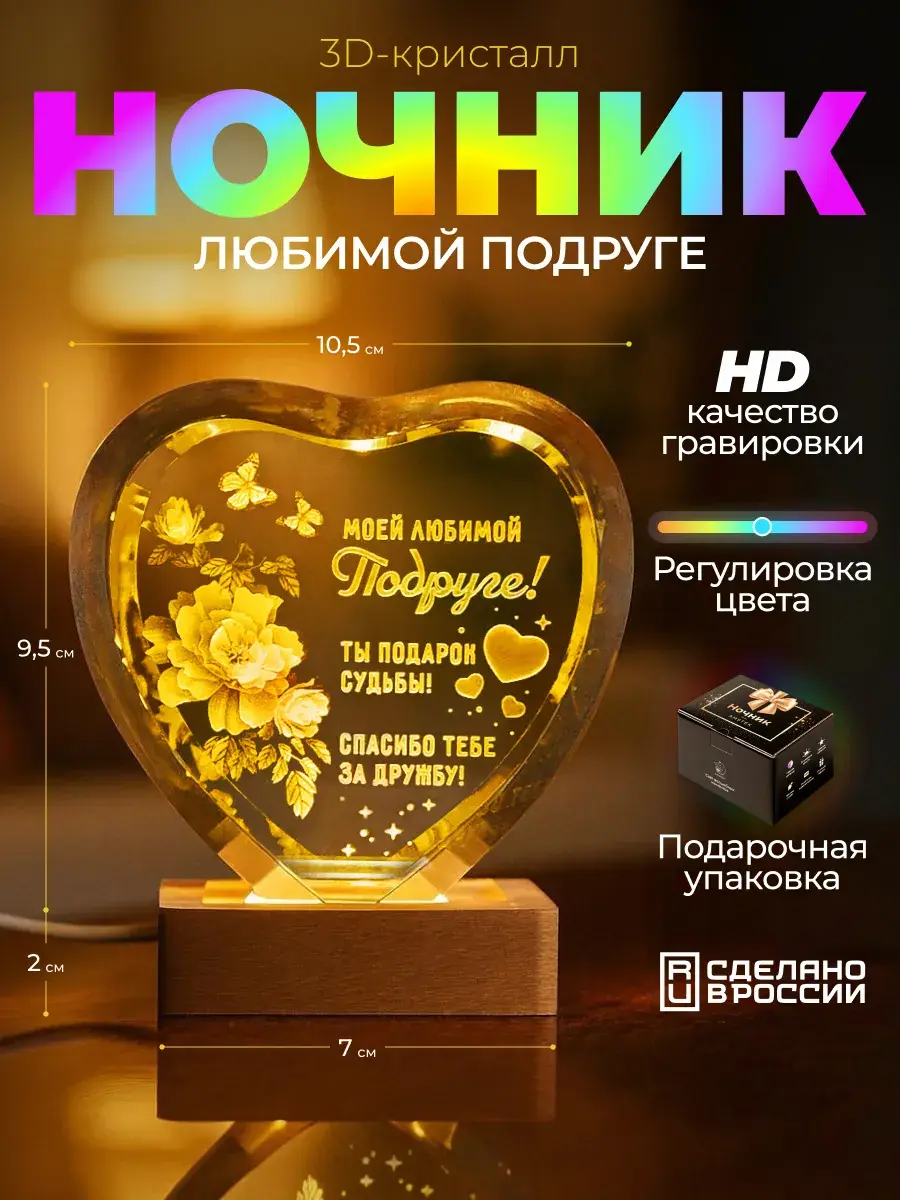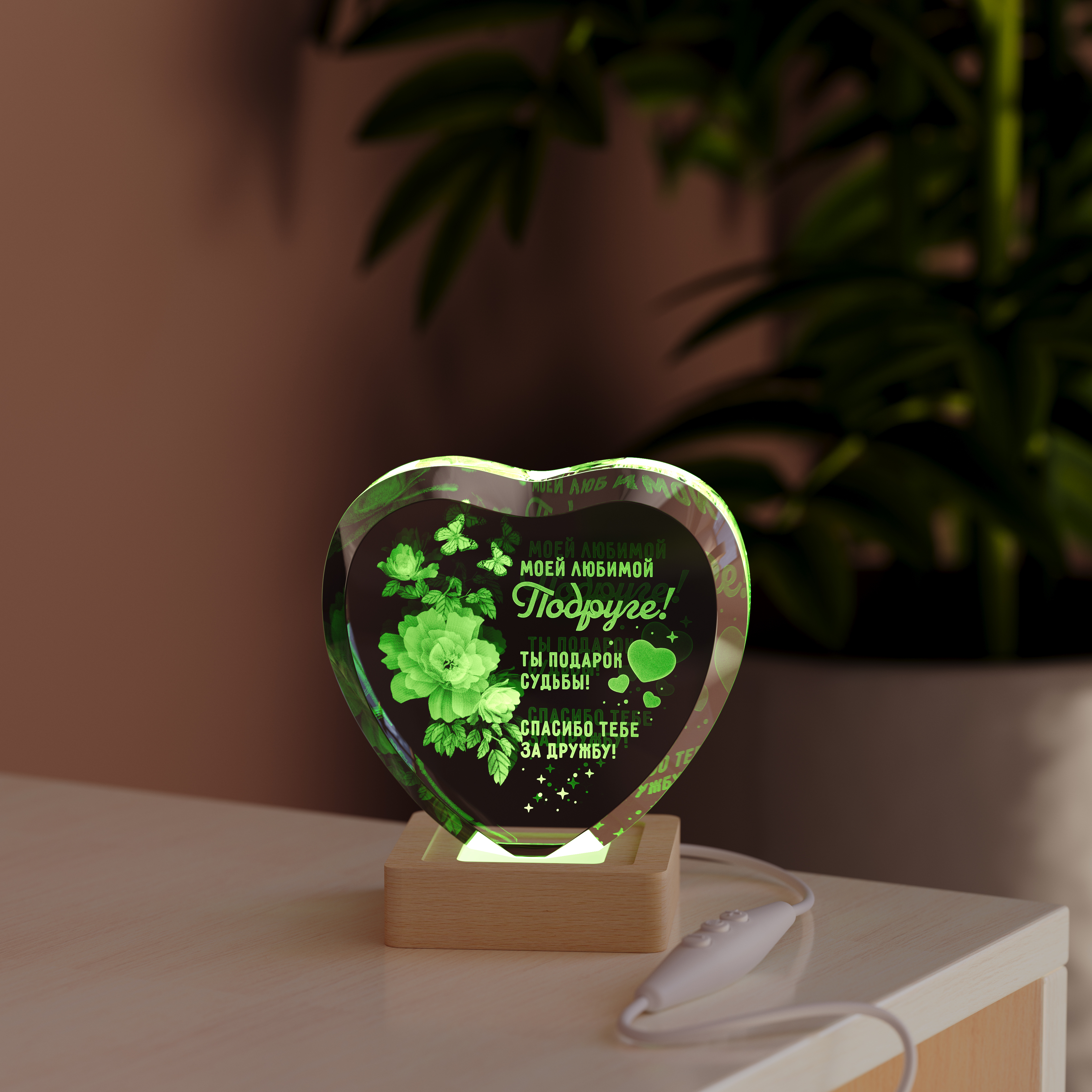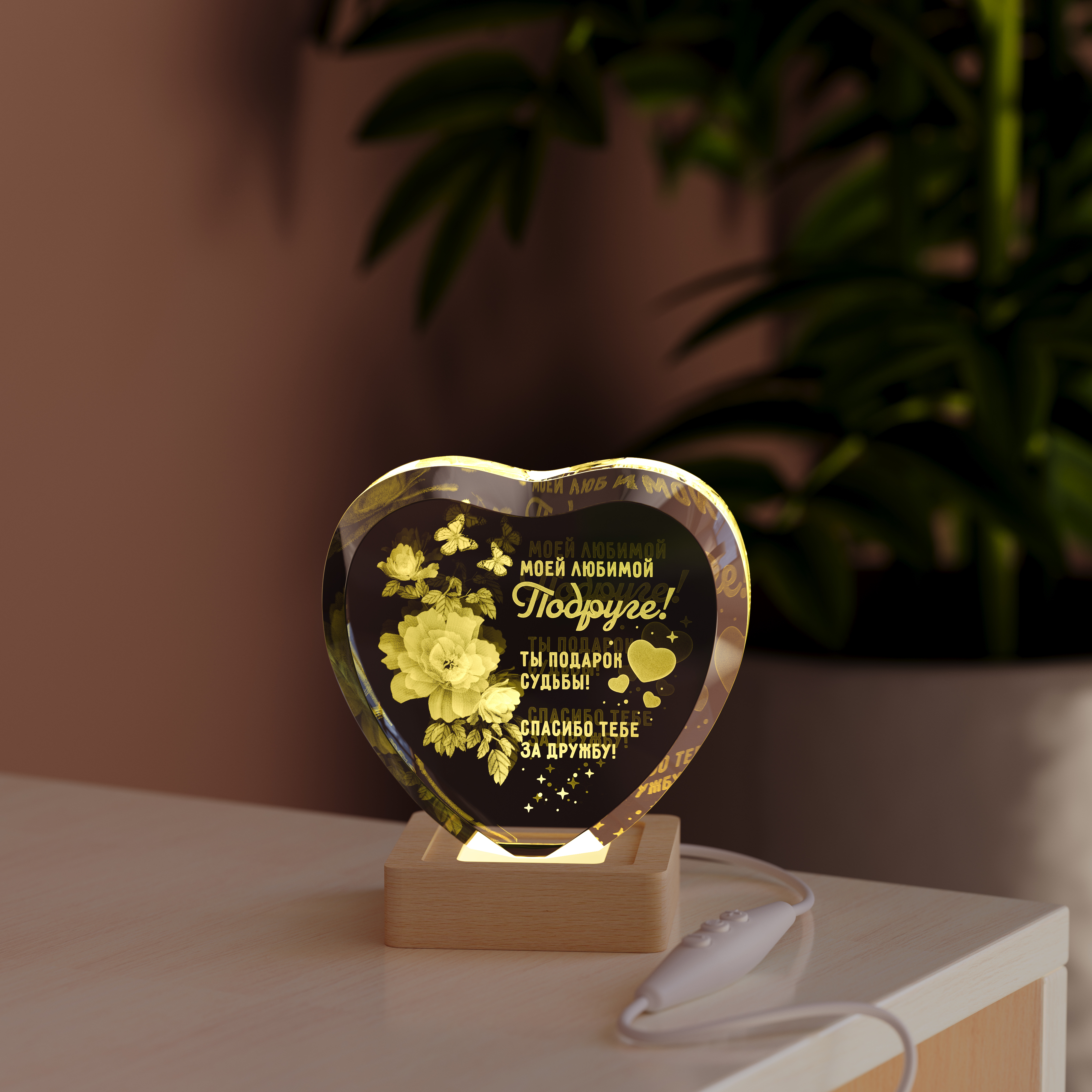 Настоящая дружба — это свет, который согревает в любой ситуации, и иногда хочется облечь это чувство в осязаемую форму. Ночник Сердце с цветами подруге — это не просто подарок, а способ сказать "спасибо" за то, что она есть. Выполненный в форме кристального сердца, он заключает в себе нежные цветы и теплое послание, посвященное именно ей, как символ вашей крепкой и красивой связи.