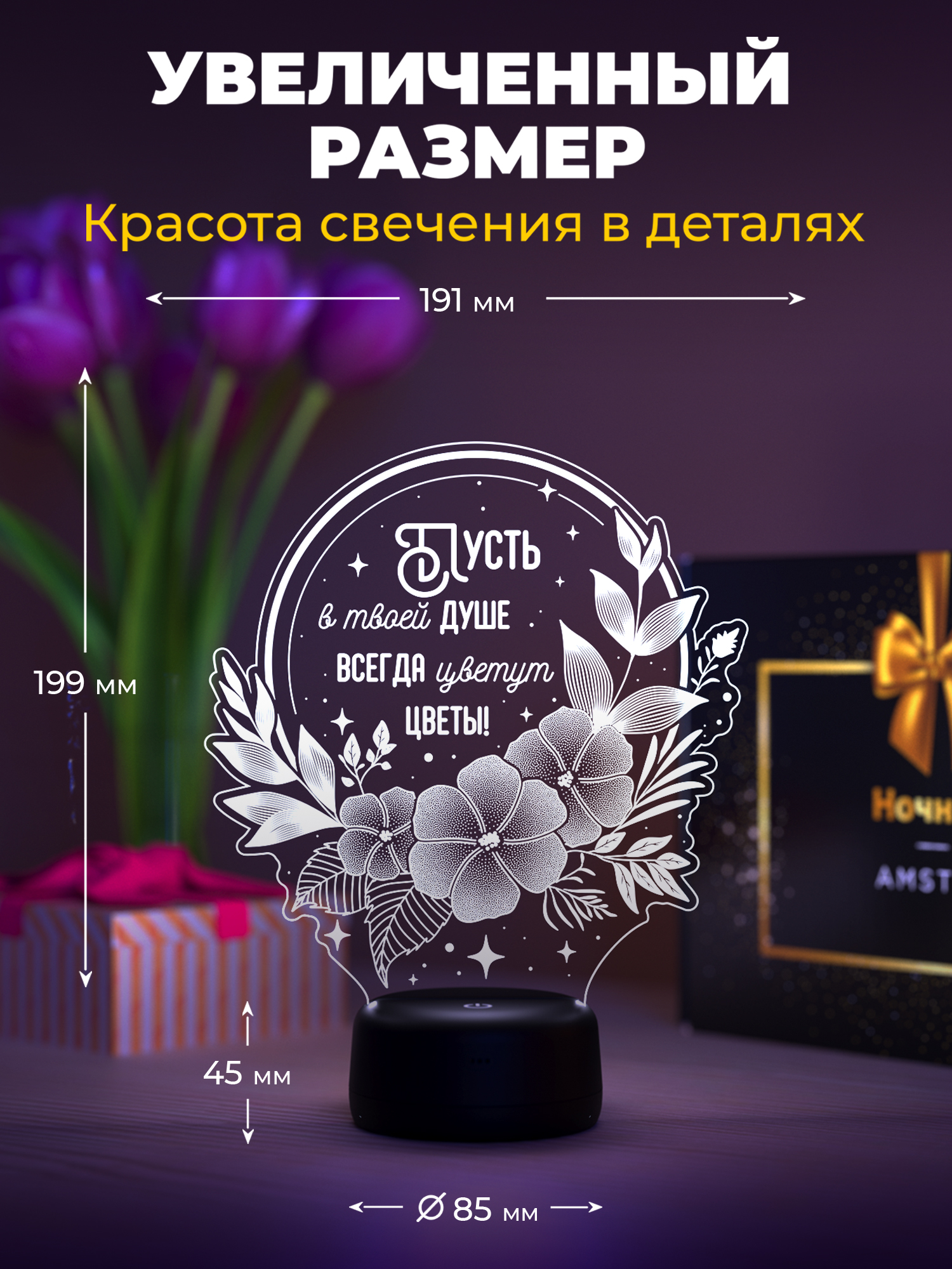 Ночник оснащён 16 цветами свечения, что позволяет менять настроение пространства от нежного тёплого до более насыщенного оттенка. Регулировка яркости помогает подобрать комфортный уровень света, а переключение цветов и управление яркостью осуществляются с помощью пульта дистанционного управления, делая использование простым и удобным. Высокое качество рисунка подчёркивает каждую деталь цветочной композиции и надписи, а качественные материалы обеспечивают аккуратный внешний вид и долговечность. Презентабельная упаковка делает этот ночник полностью готовым решением, если вы выбираете подарок со смыслом.