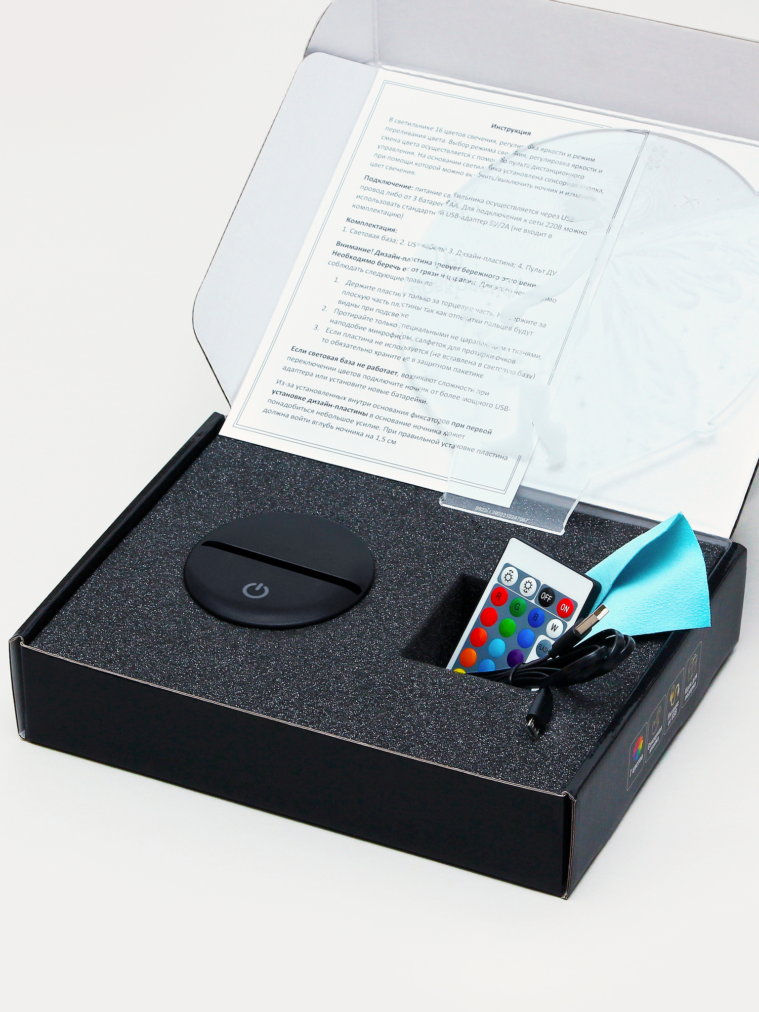 USB-провод - 1 шт , Дизайн-пластина - 1 шт , Подарочная упаковка - 1 шт , салфетка для ухода - 1 шт , Световая подставка - 1 шт , пульт дистанционного управления