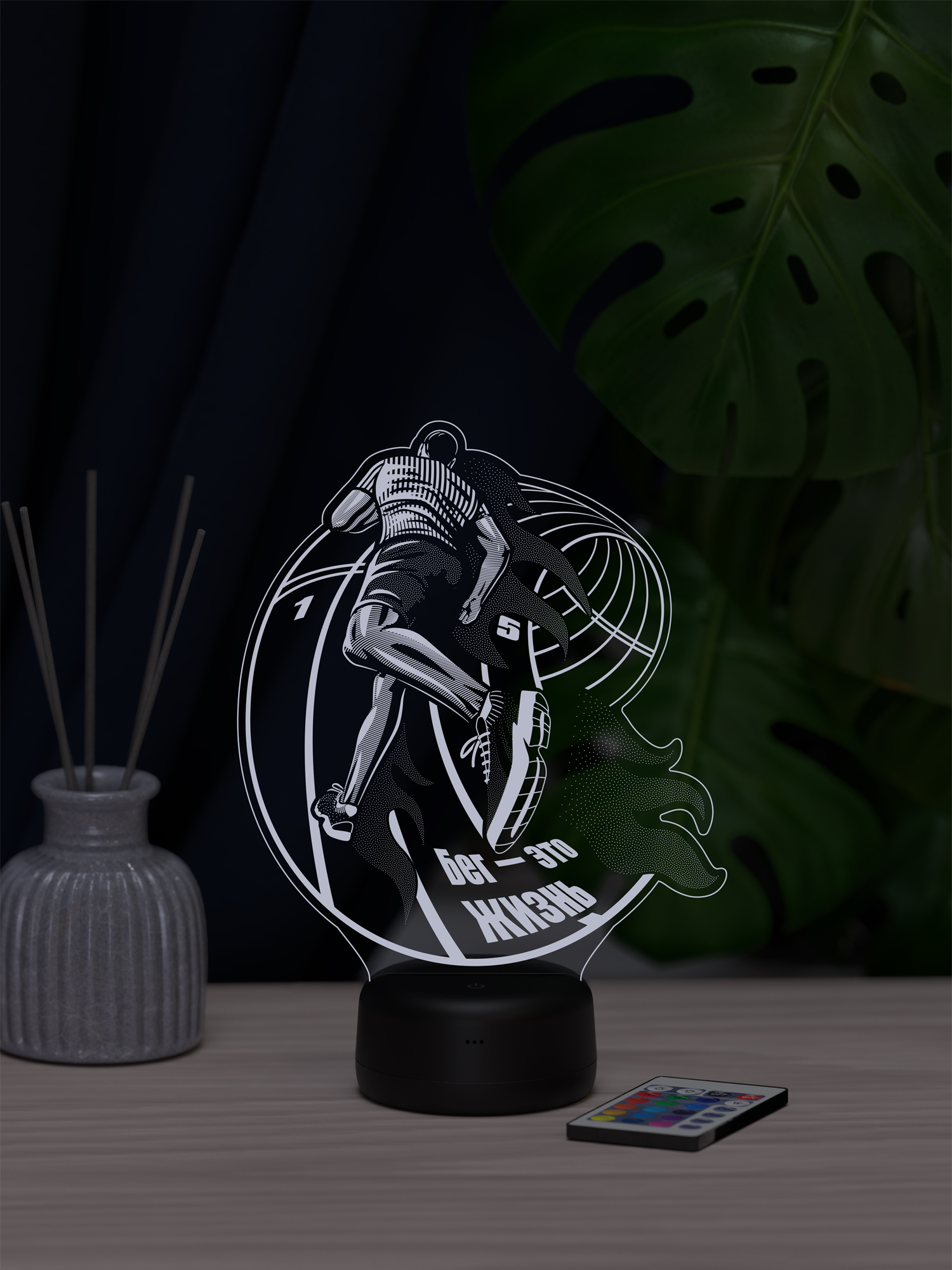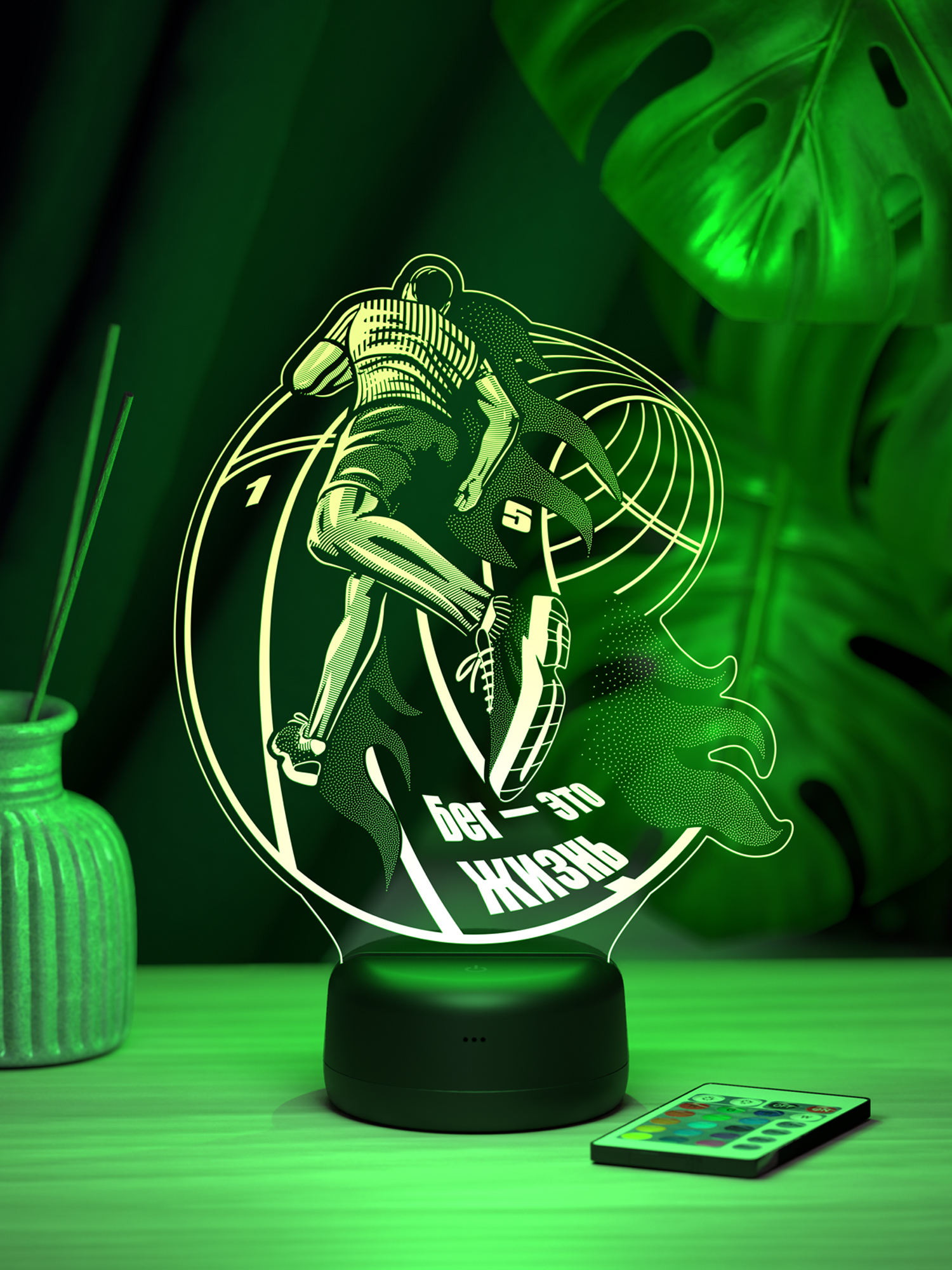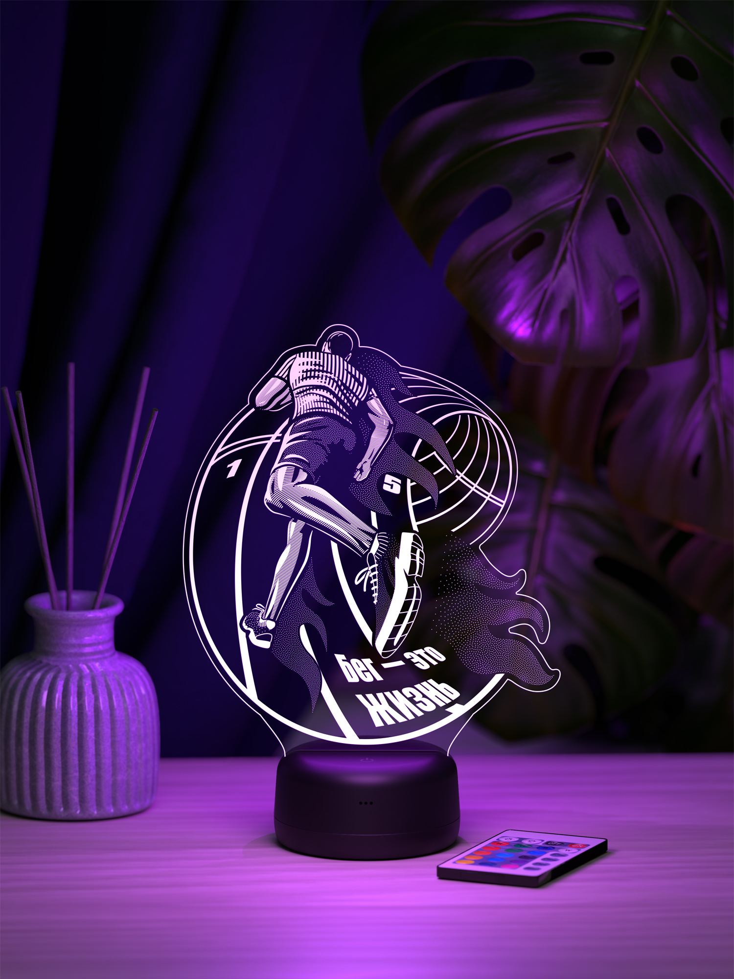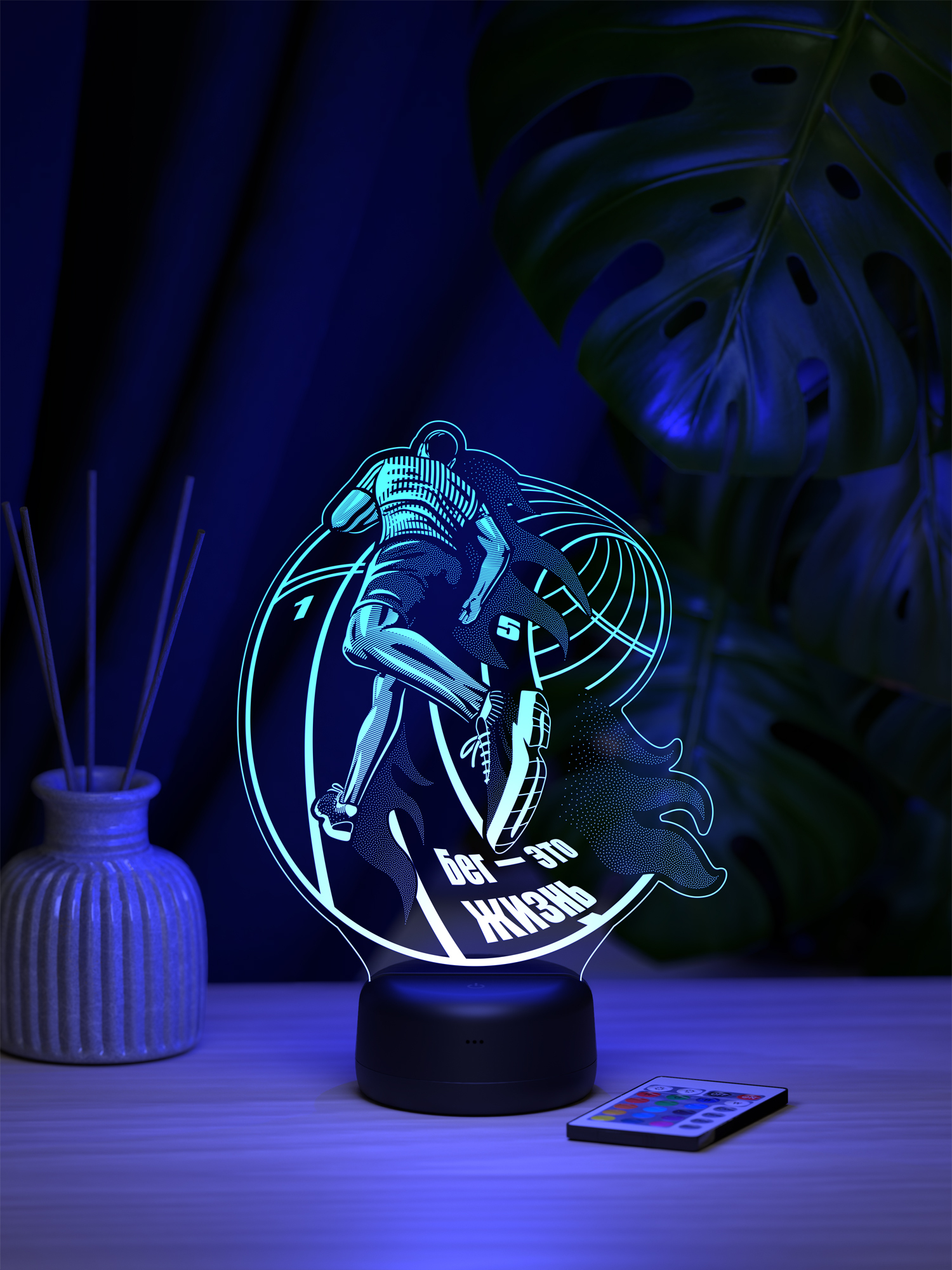Представляем вашему вниманию ночник, вдохновленный динамикой и энергией движения. На его поверхности гордо красуется мотивирующая надпись «Бег - это жизнь», делая его больше, чем просто источником света. Этот ночник станет превосходным подарком для юных спортсменов, для детей, увлеченных активным образом жизни, а также для взрослых, которые ценят движение и стремление к цели. Он будет уместен как по случаю спортивных достижений, так и как символ вдохновения на каждый день, прекрасно дополняя интерьер комнаты спортсмена, детской или подростковой спальни. Ночник способен создать особую атмосферу благодаря своему завораживающему свечению в 16 различных цветах. Вы сможете легко регулировать яркость и переключать оттенки, настраивая освещение под настроение или желаемую обстановку, используя для этого удобный пульт дистанционного управления. Высокое качество рисунка и тщательно подобранные материалы гарантируют долговечность и эстетическое удовольствие от изделия. Ночник поставляется в презентабельной упаковке, что делает его готовым подарком, способным порадовать любого получателя. Подарите свечение, которое вдохновляет и наполняет пространство энергией движения.