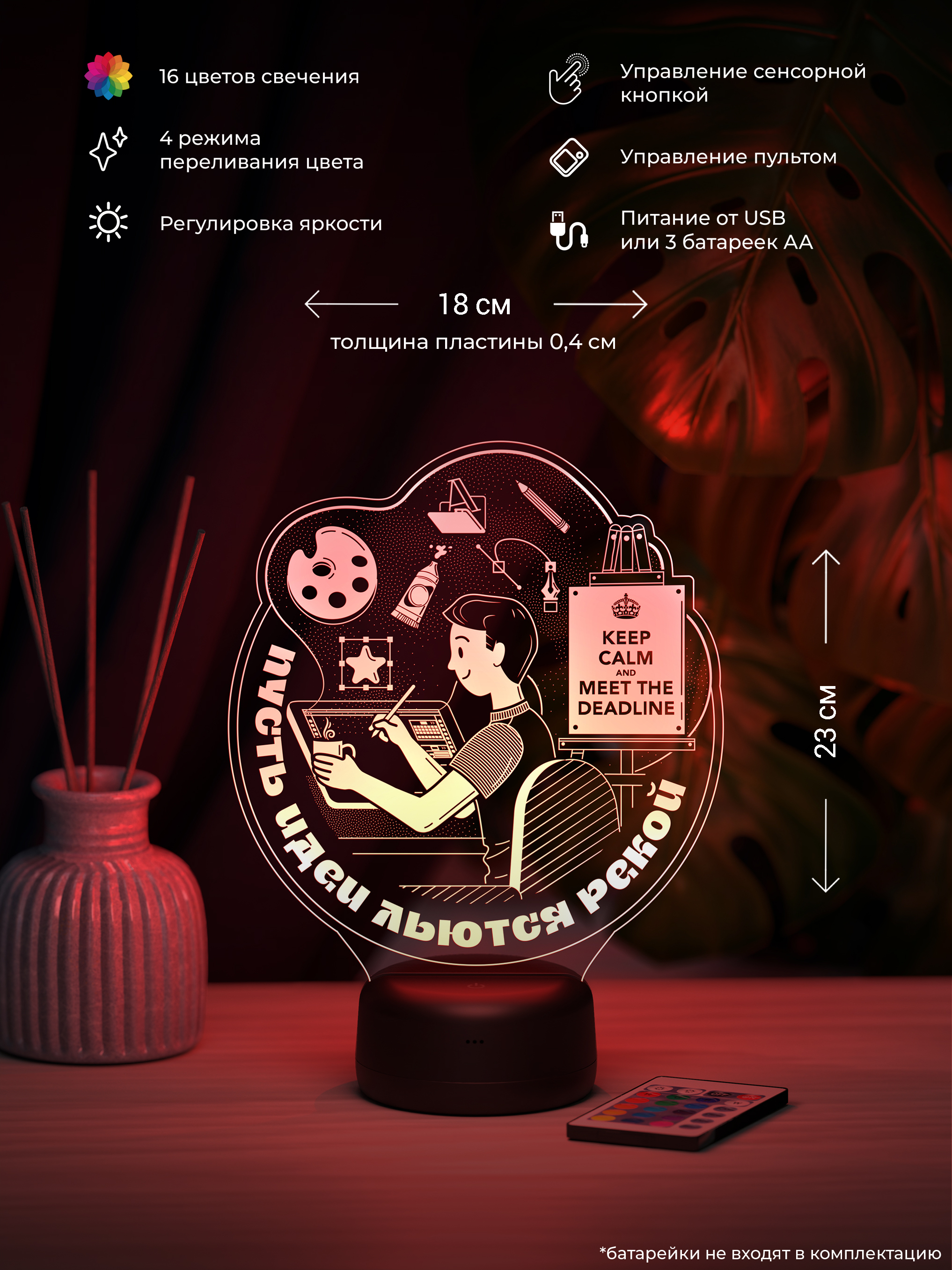 Это продуманный подарок, который говорит о вашем уважении к таланту и профессии, станет отличным решением на день рождения, профессиональный праздник или как знак признательности от команды за блестяще выполненный проект. Ночник поставляется в презентабельной упаковке, готовый стать вашим особенным подарком.