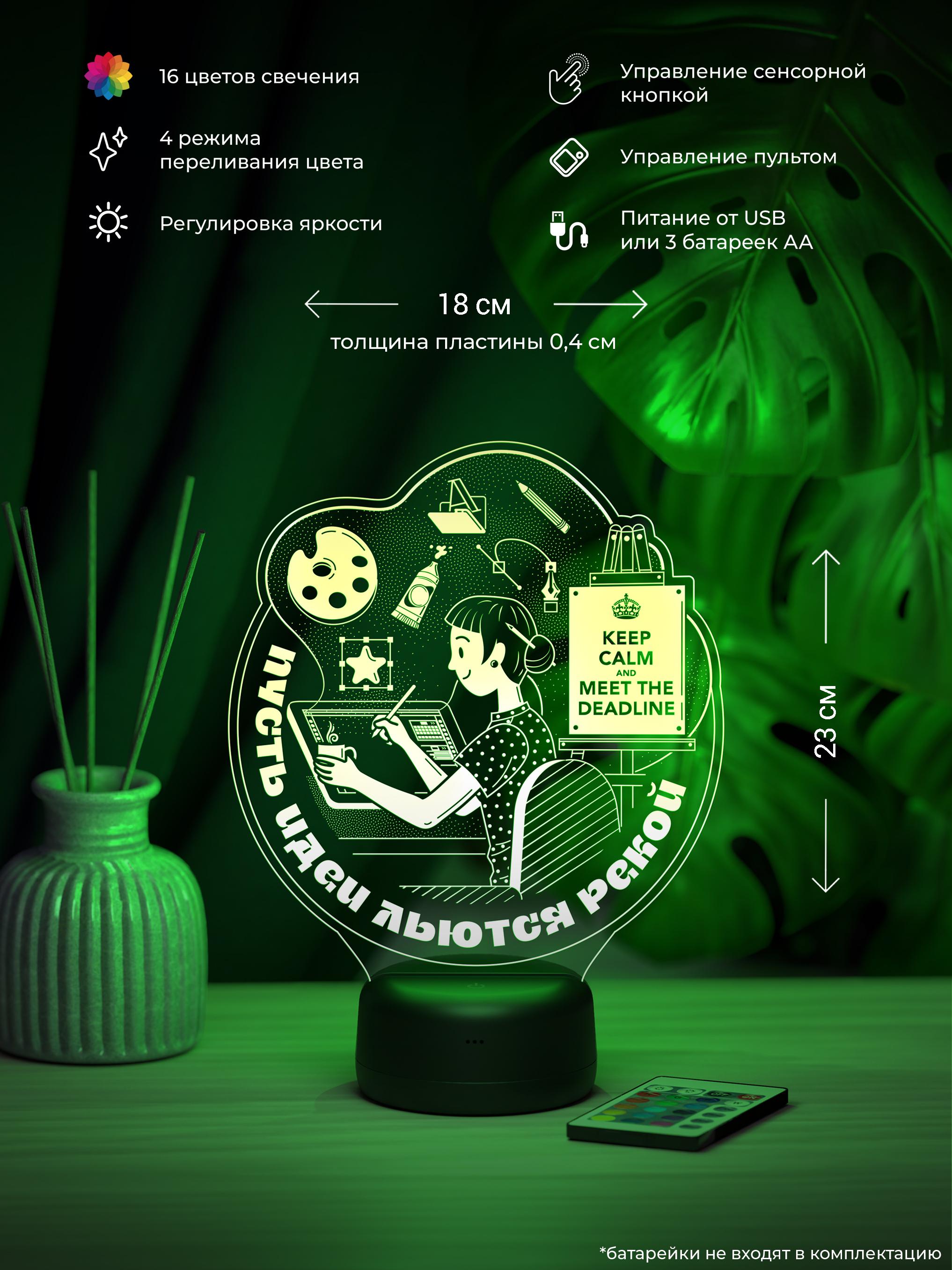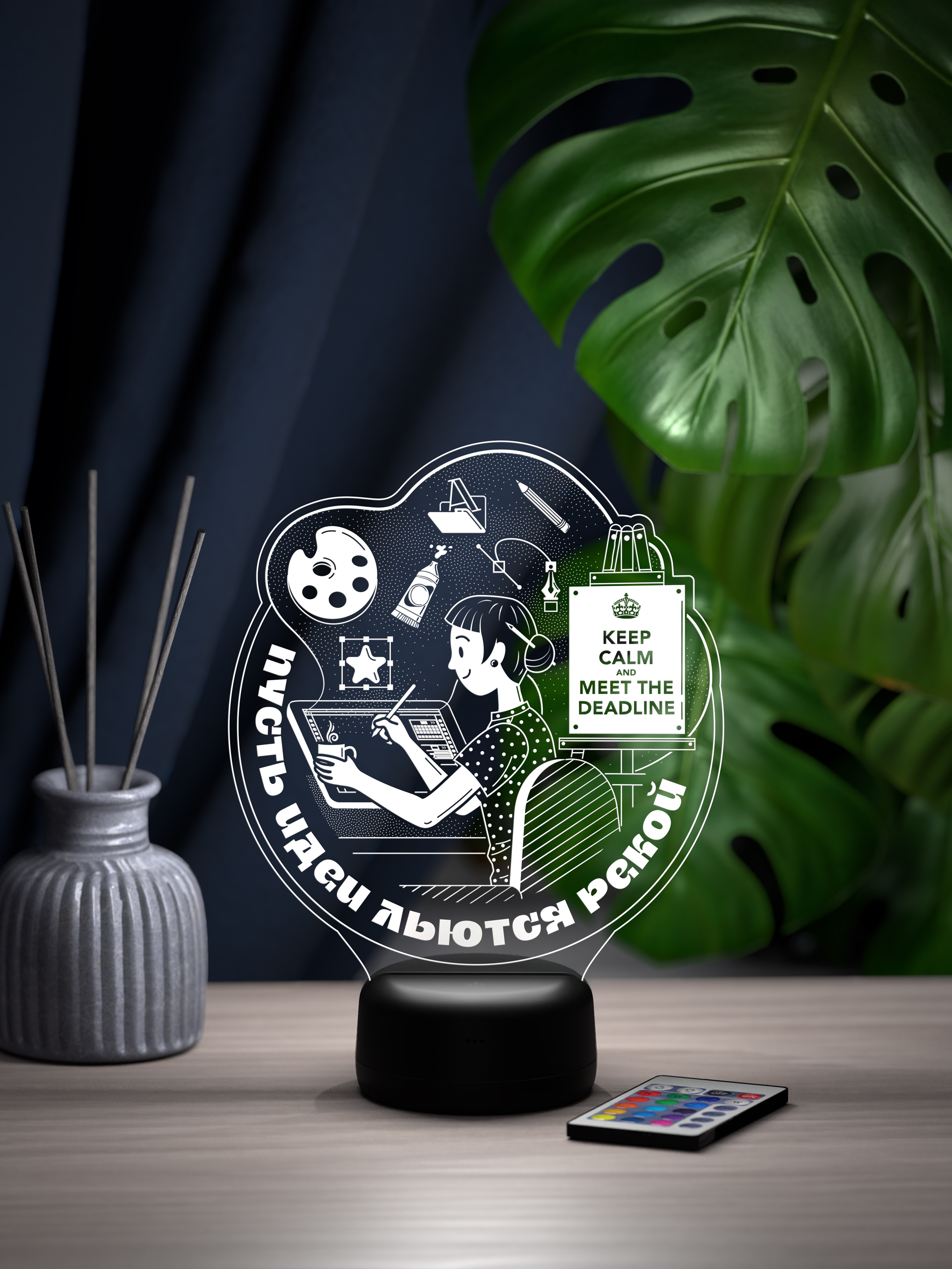 Тематический дизайн отражает ее творческую натуру, а высокое качество материалов и четкость гравировки говорят о внимании к деталям, которое она непременно оценит. Этот ночник — не просто предмет для интерьера, а источник мягкого свечения, который поможет настроиться на нужную волну.