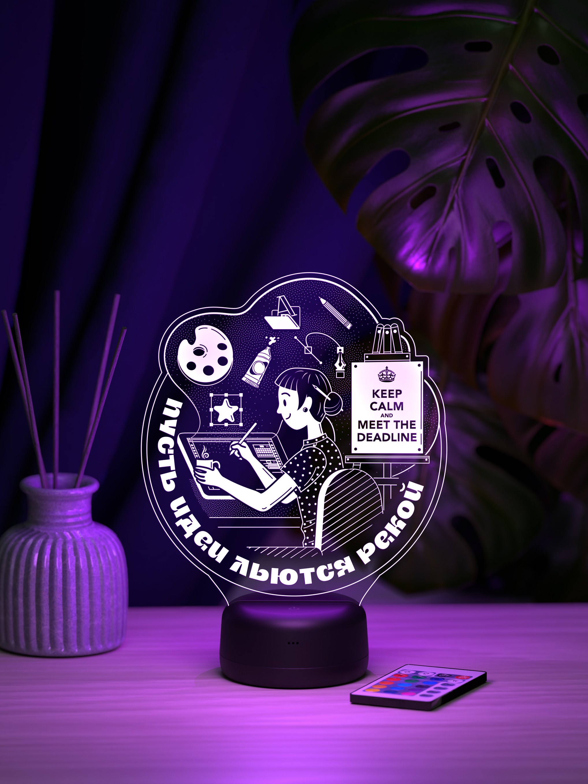 Ночник Дизайнер — это элегантный инструмент для создания атмосферы. Он создан для женщины-дизайнера, которая понимает, как сильно свет влияет на настроение и вдохновение. С помощью одного пульта она сможет окутать свою студию или комнату вдохновляющим бирюзовым свечением для работы или нежным лавандовым для отдыха. В ее распоряжении 16 оттенков, чтобы управлять палитрой своего пространства.