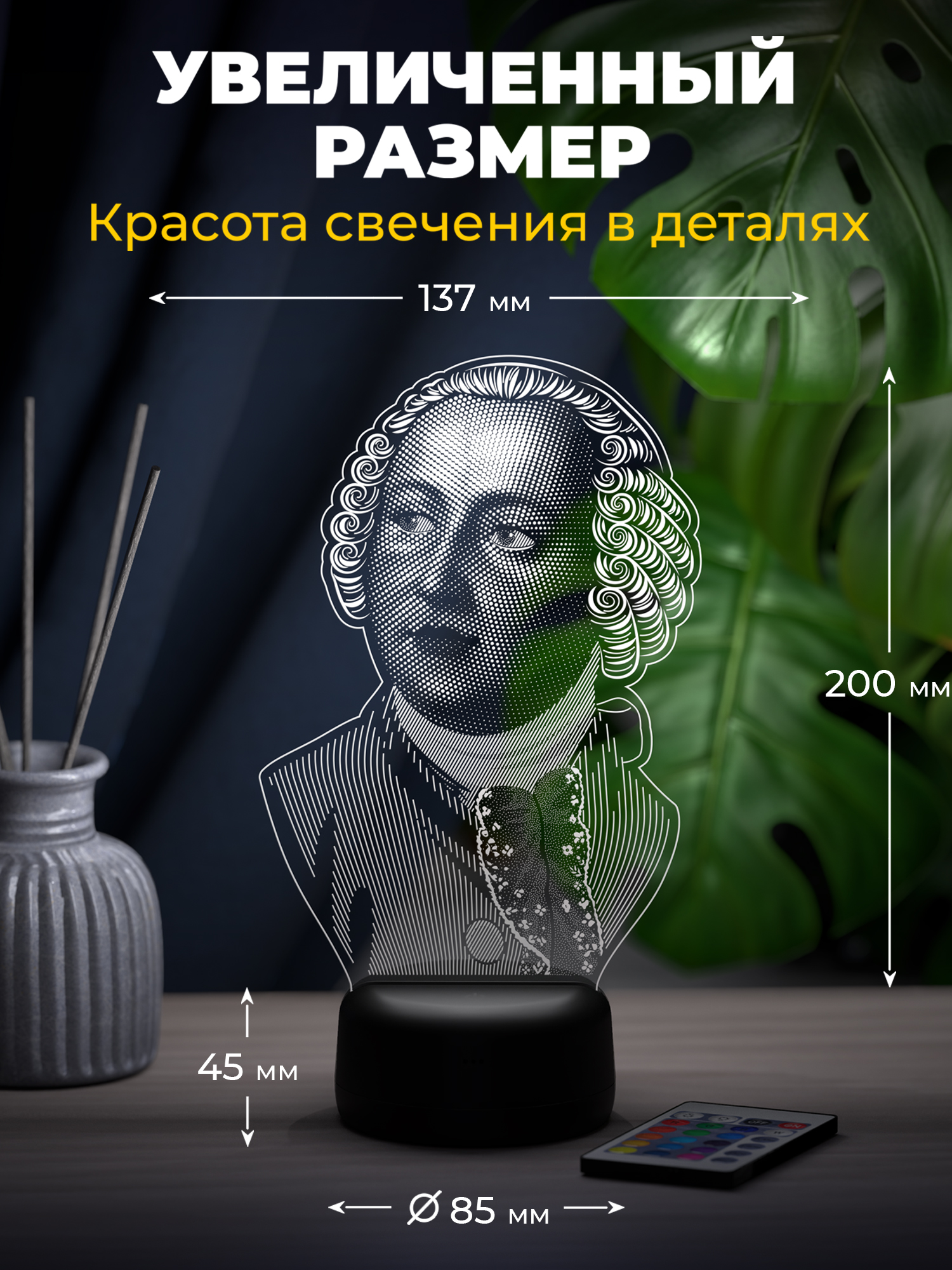 Ночник Ломоносов станет выразительным акцентом, который наполнит интерьер интеллигентным настроением и создаёт спокойную атмосферу. Мягкое свечение подчёркивает образ великого учёного и усиливает ощущение уюта, напоминая о стремлении к знаниям, труду и силе мысли, которые связаны с именем Ломоносова. Ночник поддерживает настроение сосредоточенности и уважения к науке, гармонично дополняя домашнее или рабочее пространство. Доступно 16 цветов свечения, предусмотрена регулировка яркости, а переключение цветов и регулировка яркости выполняются пультом дистанционного управления, что позволяет легко менять характер света. Высокое качество рисунка выглядит чётко и аккуратно, используются качественные материалы, а презентабельная упаковка сразу подходит для подарка. Такой подарок можно подарить учителю, преподавателю, студенту, выпускнику, коллеге, руководителю или человеку, который ценит историю, культуру и научное наследие, по случаю дня рождения, Нового года, 1 сентября, Дня учителя, выпускного, окончания обучения или как знак уважения и благодарности. Ночник органично вписывается в интерьер кабинета, гостиной или рабочего пространства и каждый вечер добавляет атмосферу спокойствия и вдохновения.