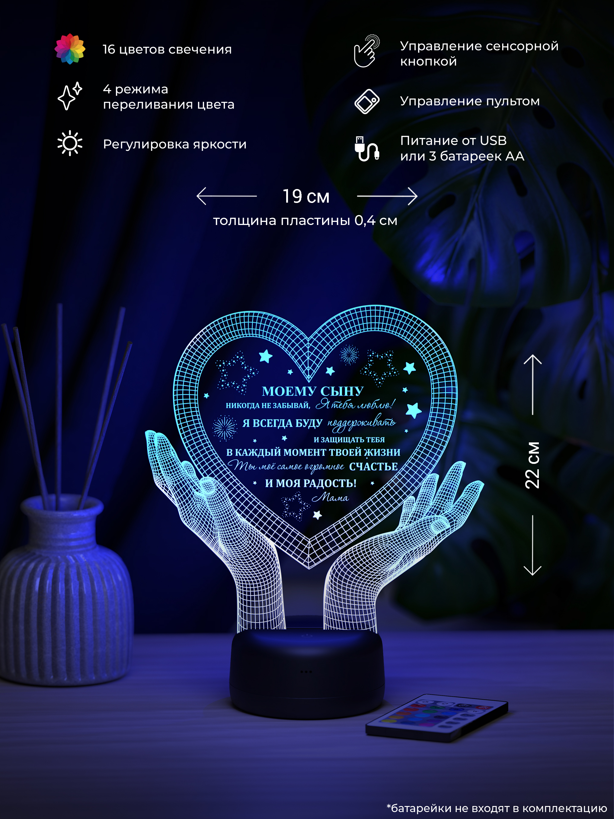 Мы предлагаем уникальные ночники от Amstek, которые создадут атмосферу сказки и волшебства в любом интерьере. Это отличный подарок для людей любого возраста — как для детей, так и для взрослых! Каждый светильник способен менять цвет, предлагая 16 различных оттенков: белый, красный, зеленый, фиолетовый, желтый, бирюзовый и голубой. Кроме того, есть режимы плавного переключения цветов, когда оттенки сменяются автоматически. Управление происходит с помощью сенсорной кнопки, расположенной на основании светильника, либо при помощи пульта дистанционного управления. Ночник  работает от 3-х батареек AA (в комплект не входят) или через USB-кабель. Одним из главных преимуществ является то, что корпус не нагревается, что делает использование абсолютно безопасным. Когда требуется выбрать подарок, задача становится сложной, особенно с учетом всего многообразия на рынке. Но наш ночник станет настоящей находкой! Он создаст уют и романтику в любое время суток, став идеальным элементом декора в темных уголках вашего дома. Мы уверены, что такой необычный подарок не останется незамеченным — его оценит каждый, независимо от возраста и пола.